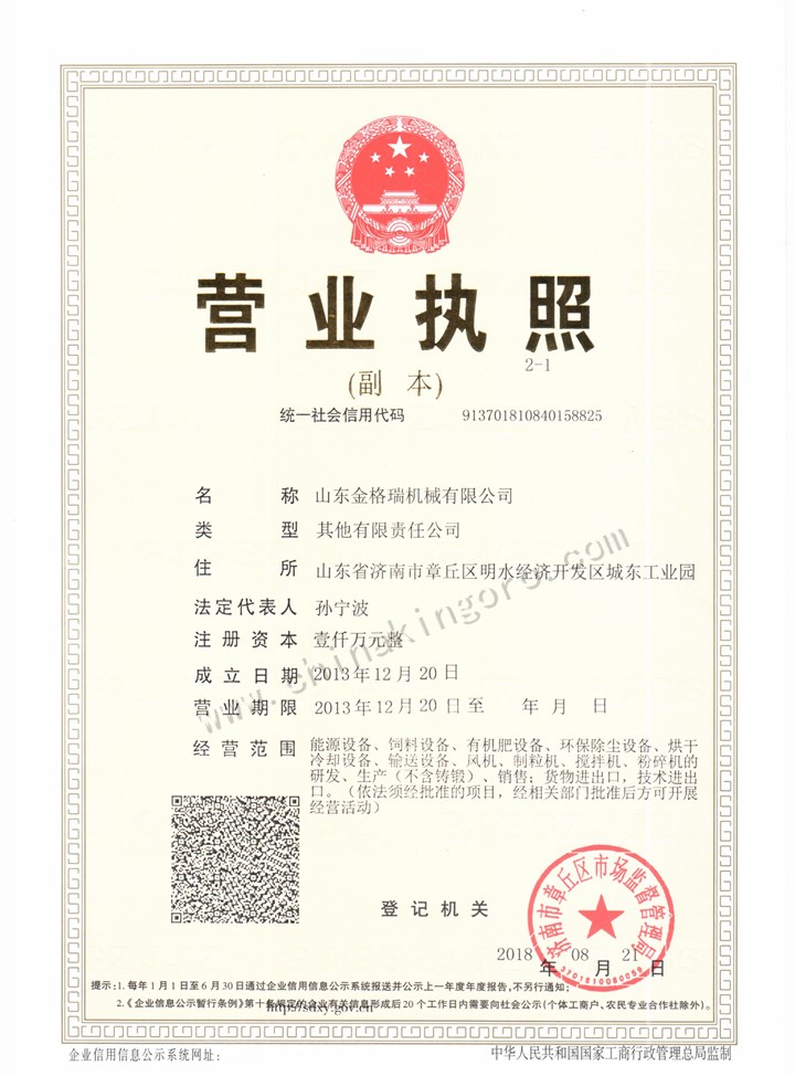 山東金格瑞機械有限公司,是一家集科研開發、制造銷售、國際貿易為一體的企業。主營顆粒機、粉碎機、烘干機等生產線設備,現公示公示營業執照。